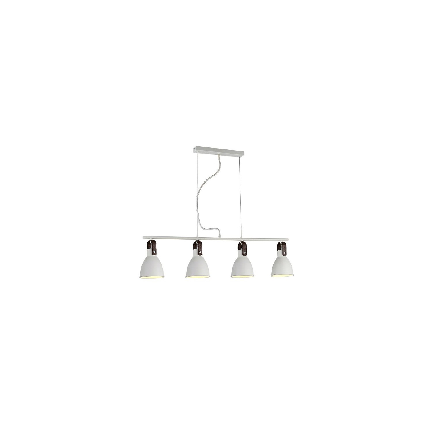 TESSIO 4 składa się z czterech źródeł światła zamontowanych na prostej szynie. Zarówno osłony, jak i wszystkie elementy konstrukcyjne wykonano z trwałego metalu, lakierowanego na modny obecnie biały kolor. Każdy klosz dodatkowo ozdobiono skórzanym paskiem, przełamującym monochromatyczność lampy.