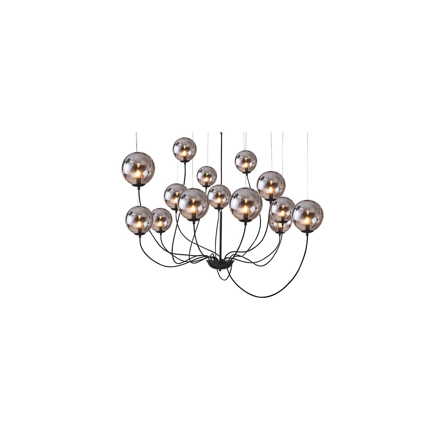 Lampa wisząca CONFLUX 14 została wyposażona w aż 14 niezależnych źródeł światła okrytych kulistymi kloszami. Każdy z nich jest podwieszony do sufitu. U dołu przytwierdzono do nich długie, zwisające przewody, stanowiące dodatkowy element dekoracyjny produktu. Całość konstrukcji wykonano z trwałego metalu w kolorze czarnym. Do zrobienia kloszy użyto natomiast szkła o pięknym, srebrzystym odcieniu chromu.
