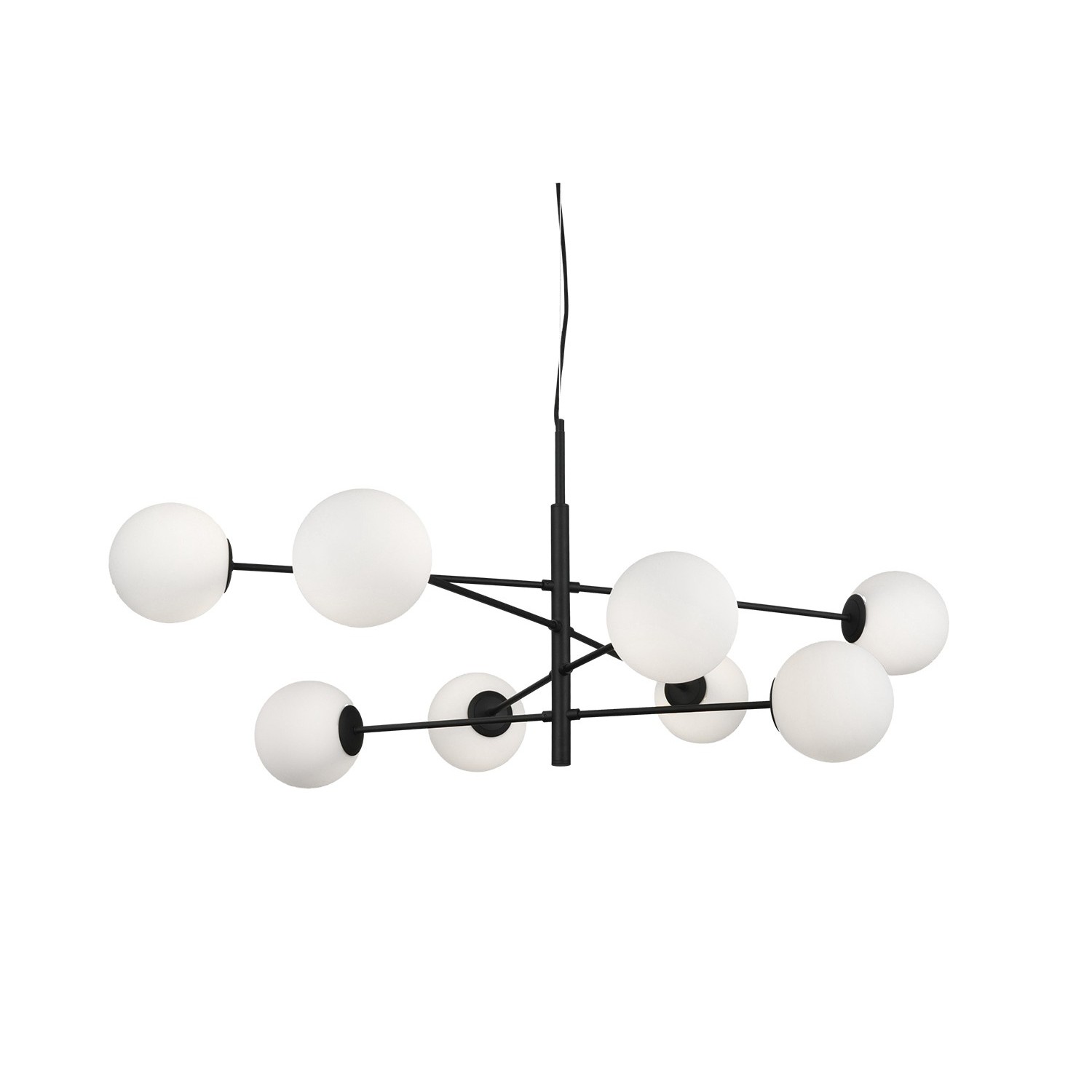 OVIEDO 8 to lampa zaliczana do kategorii opraw molekularnych, czyli takich, których wygląd przypomina budowę cząsteczki. Pod każdym z ośmiu szklanych, kulistych kloszy jest miejsce na pojedyncze źródło światła (również produkty LED). Kule są połączone między sobą prostymi ramionami, wykonanymi z metalu. W naszej ofercie lampa występuje w kolorze czarnym lub czarno-złotym.