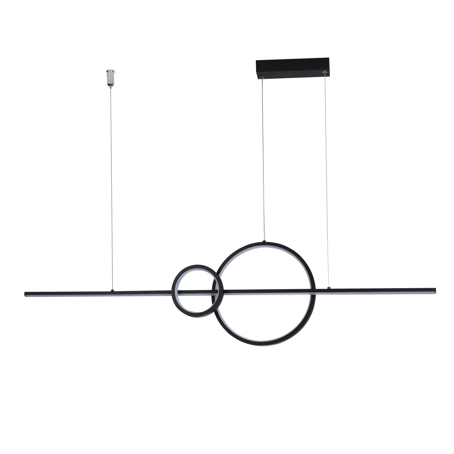 SARA BK składa się z trzech elementów, podwieszonych do sufitu na długich przewodach. W ramach konstrukcji zastosowano dwa okręgi i jedną podłużną listwę, wykonane z trwałego aluminium i PVC. Na ich powierzchni znalazły się zintegrowane źródła światła LED, odznaczające się wysoką energooszczędnością i żywotnością większą niż klasyczne żarówki. W naszej ofercie produkt występuje w dwóch wariantach barwnych – jednolitej czerni lub w odcieniu modnego obecnie złota.